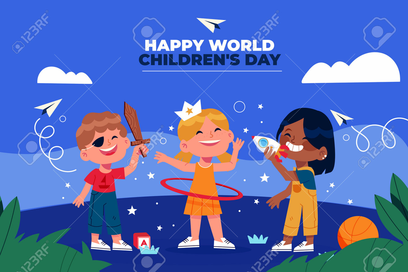 Happy World Kid's Day Flat Vector Illustration. Cute Little Boy and Girl Characters Playing with Soap Bubbles, Hoop, Rocket and Paper Airplane on Background. Cartoon Character Design