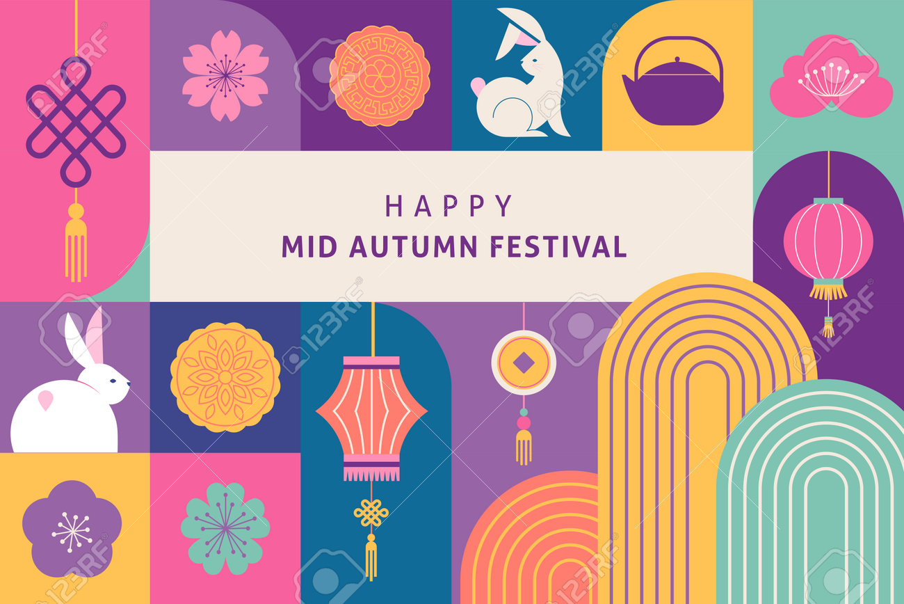 Korean Mid Autumn Festival - Chuseok. Mooncakes, bunnies rainbows and flowers, flat geometric style background and poster